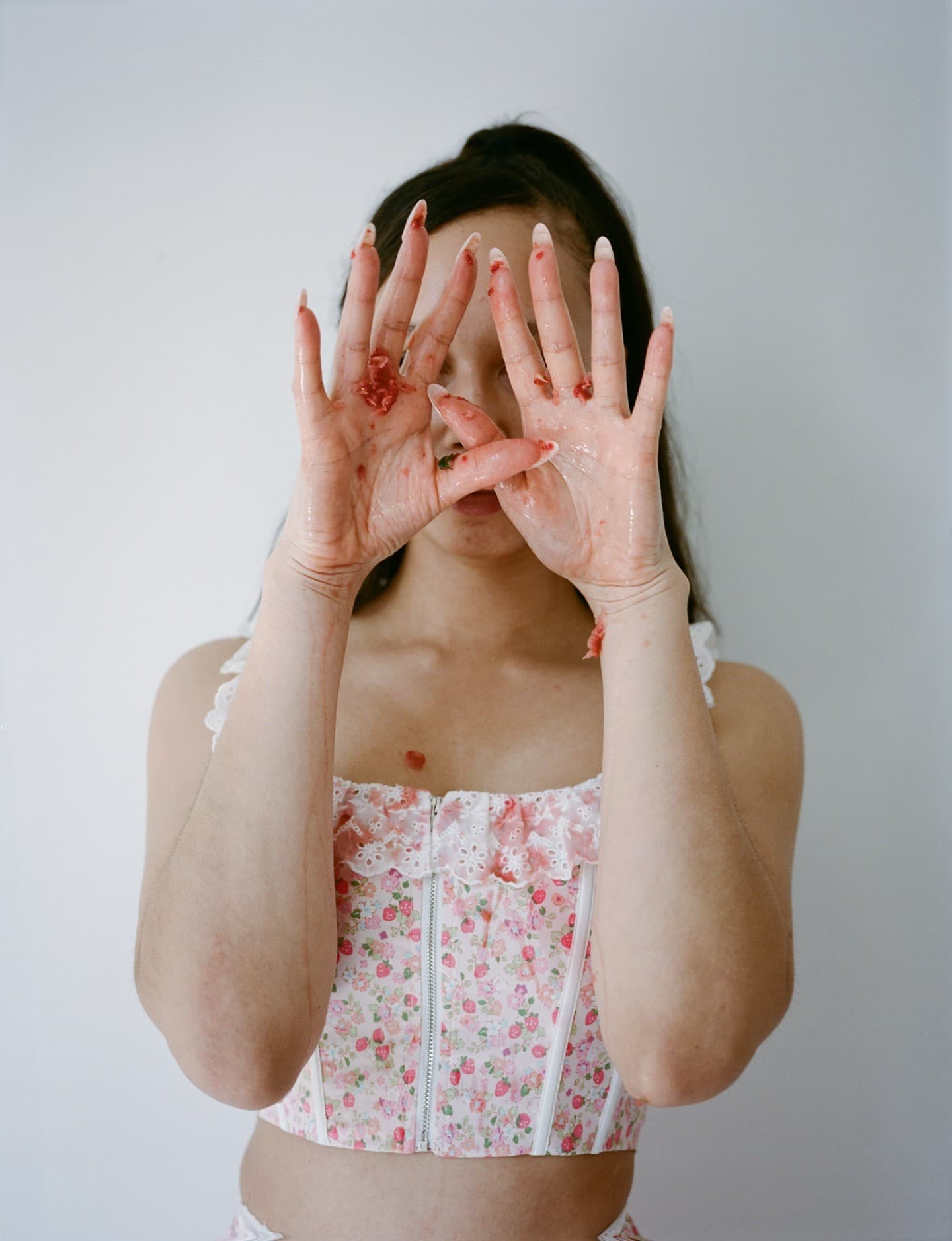 Her work carefully balances a dichotomous coin: On its underbelly side is horror, sex, and languishing lust—in film, in womanhood, in design—inspired by Ren Han, 17th-century Dutch portraiture, and Nobuyoshi Araki. But at face value, her work appears feminine, with girlish ruffles and bows galore. It's a point of frustration when her work is often compared to fellow designer Sandy Liang.