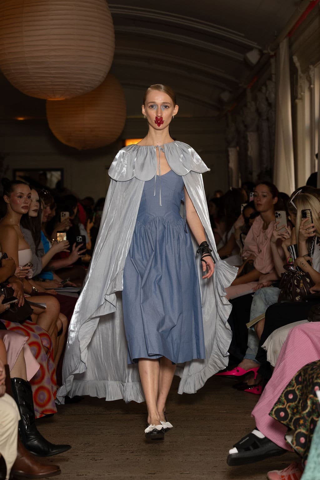 Karla TomanelliFor her Spring 2026 runway show, models walked down the runway to the sound of a live pianist at the Freehand Hotel with tiny red orchids placed on their mouth, a reference to another favorite film of Liu’s, Silence of the Lambs. Flower motifs were ever-present on a soft, silky blue cape, sheer, sexy black top, and more. Hair looked like whips from the back, tied up with a leather-like material. Clothing moved.