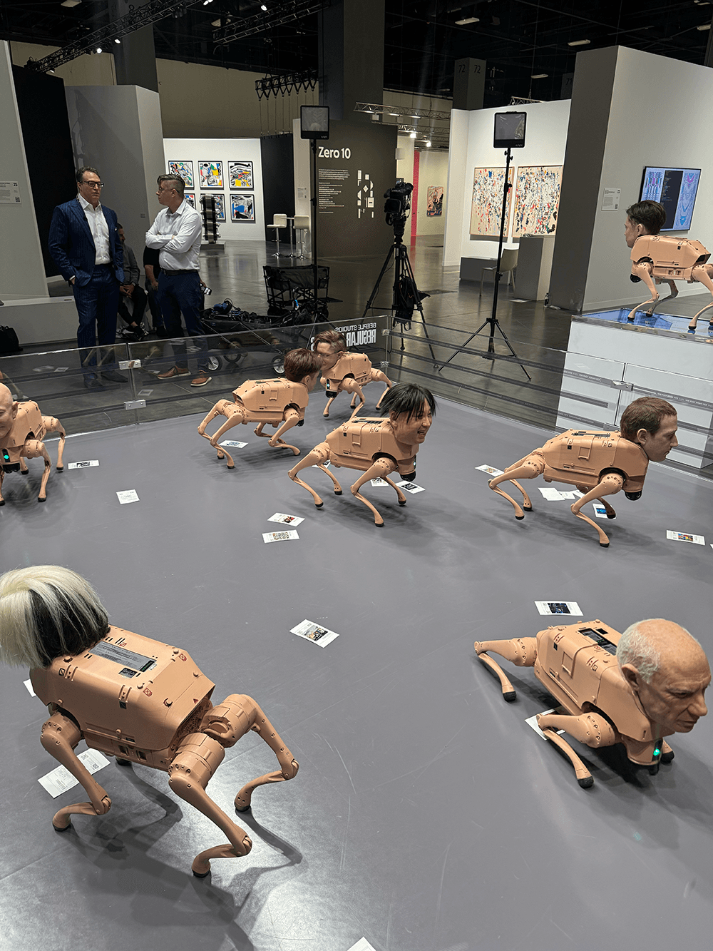 Beeple's "Regular Animals": small, robot dogs with hyper-realistic heads of billionaires. In other words, nightmare fuel (but I think that's the point).