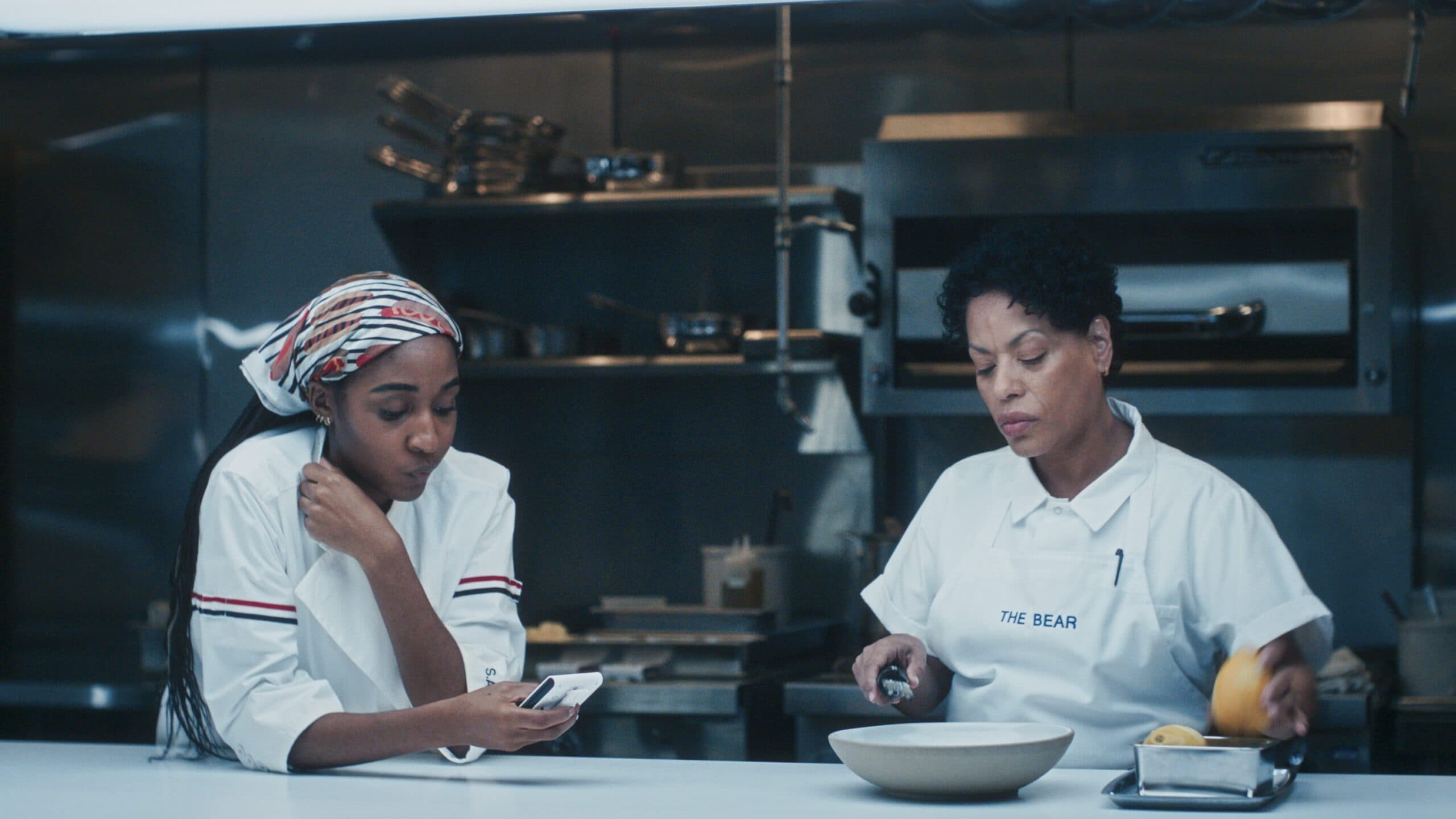 In the final episode of The Bear season four, Carmy (Jeremy Allen White) and his head chef, Sydney (Ayo Edebiri), stand outside the restaurant discussing the future of The Bear. He’s in his now-iconic $100 Merz B. Schwanen tee and apron, and she’s in full chef whites, with an unexpected twist—a blue, striped button-up layered underneath. It’s a small but striking styling choice that speaks volumes, not just about Sydney’s character arc, but about the evolution of the show itself. This subtle styling detail—which was the focus for many a meme—actually came together by chance, according to the show’s costume designer, Courtney Wheeler. “It was totally serendipitous,” Wheeler says over Zoom. “The button-up is actually Ayo’s own. She was just going to come outside in her chef’s uniform, and we were like, let's just throw something over. It fits perfectly with Syd.”