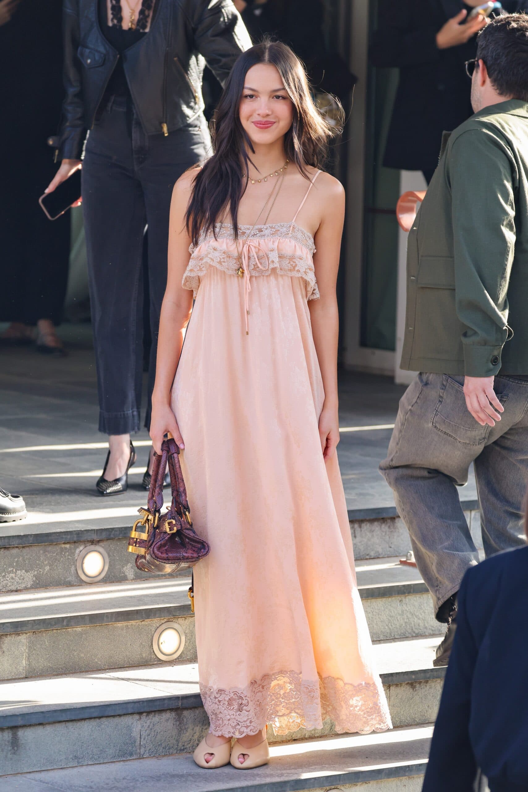 SplashNews.com/ShutterstockThe Chloé show at Paris Fashion Week called for pastel pinks and lingerie-inspired details—and Olivia Rodrigo got the memo. She wore a dress from the house's Pre-Fall 2026 Collection that was flowy, in an a-line silhouette, featured a tiered lace detail at the bust, and a lace hem. She completed her look with a purple Chloé paddington bag.