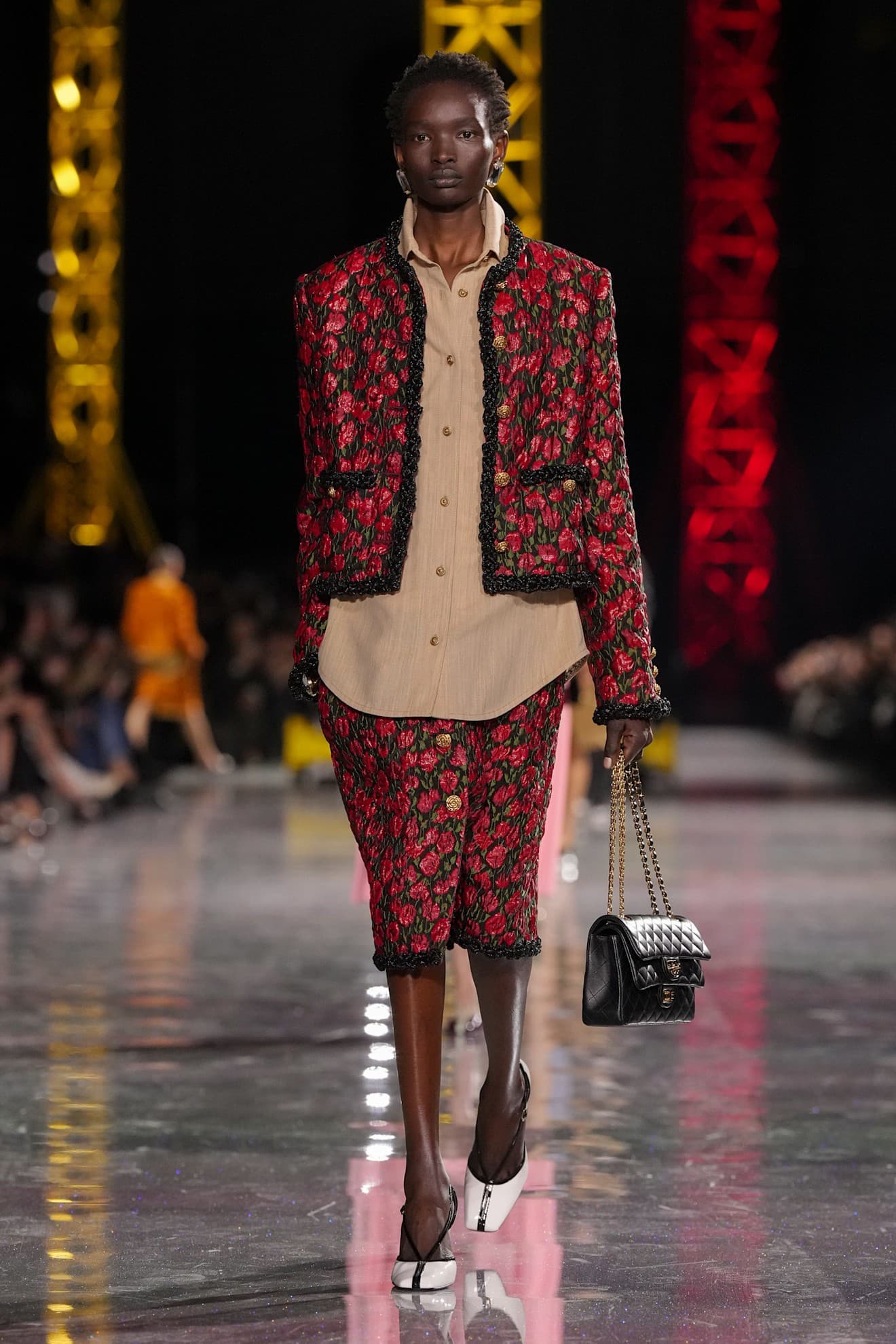 LaunchmetricsWe witnessed this through the two polarities on the runway. First, a procession of classic Chanel suits in black and cream, then daywear in the form of houndstooth bombers and long-line, insouciant blazers with rolled sleeves; these were paired with dresses and faux skirts that gave Chanel’s classic drop-waist silhouette an entirely new meaning, with belts fastened halfway down the thigh and flippy, pleated skirts starting there and ending at the knee, reminiscent of the belted mini skirts at Miu Miu’s blockbuster Spring/Summer 2022 collection.
