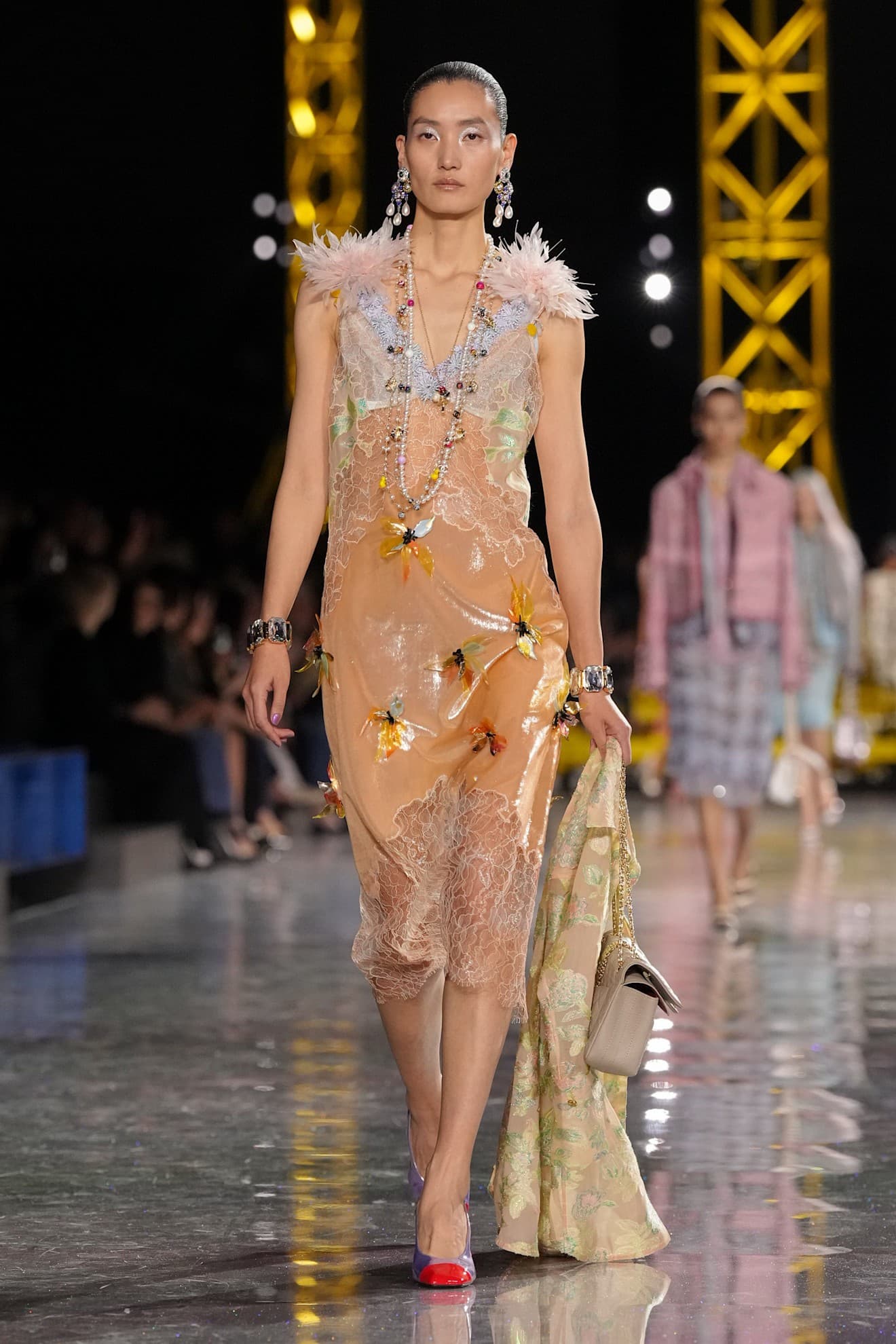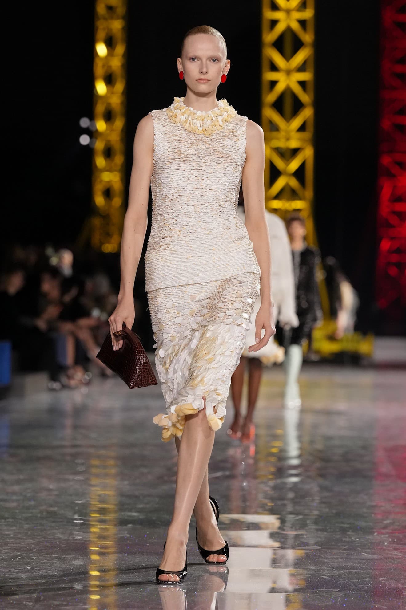 LaunchmetricsChanel’s key mantle has always been the suit—this is the central canvas of Gabrielle Chanel’s legacy—and Blazy makes a point of keeping this silhouette central to the codes of the house while offering reinvention at every turn. His suits were knitted, woven with silicone, lurex, and even adapted into iridescent glo-mesh in the evening portion of the collection. These are accompanied by watery lurex slip dresses trimmed with cotton candy lace, silk jerseys woven with tweed, scalloped sequin dresses that resembled fish scales as they caught the light in movement, and neatly-cut coats with great textured collars.