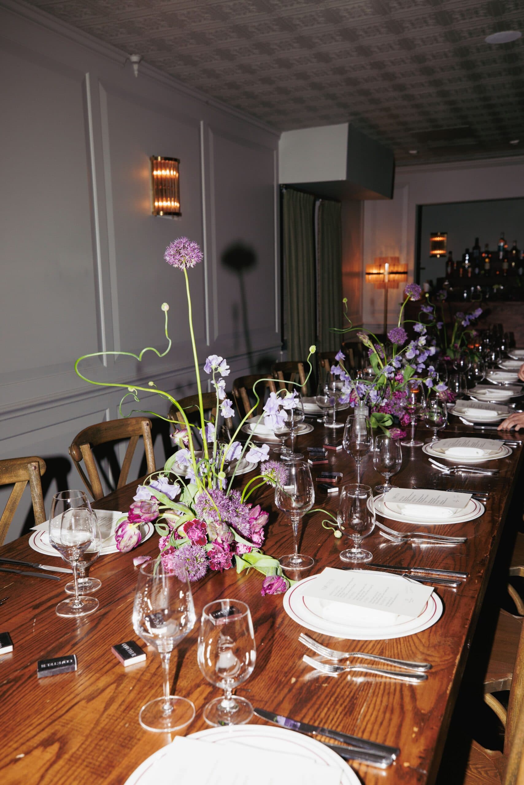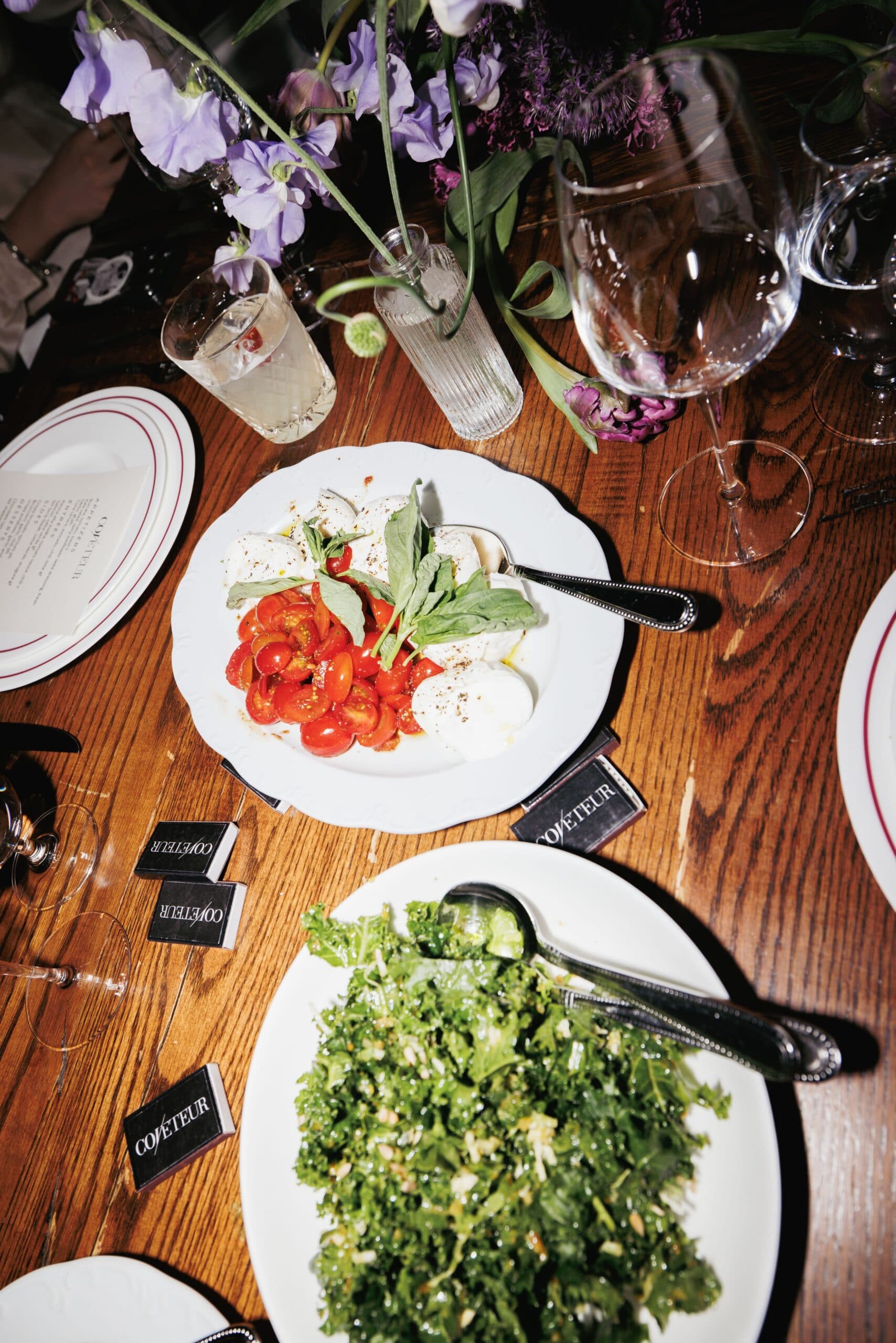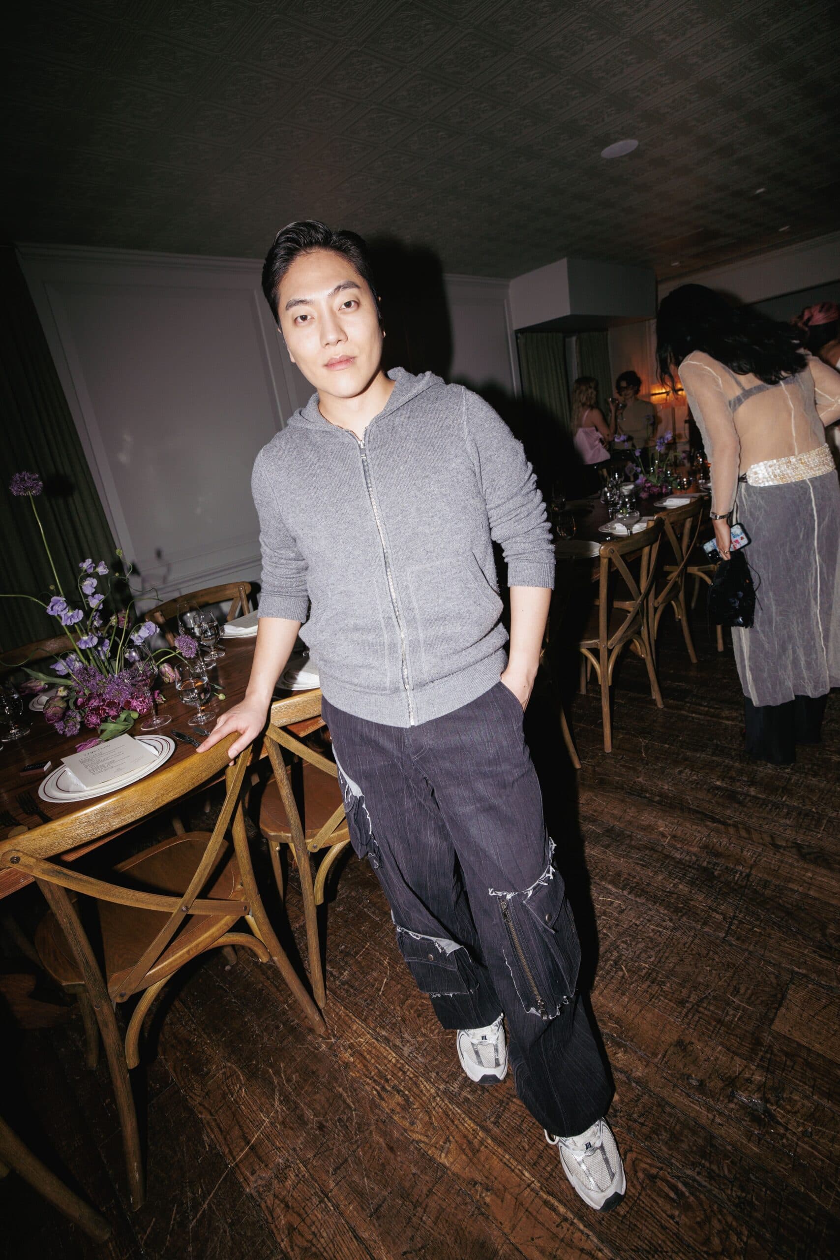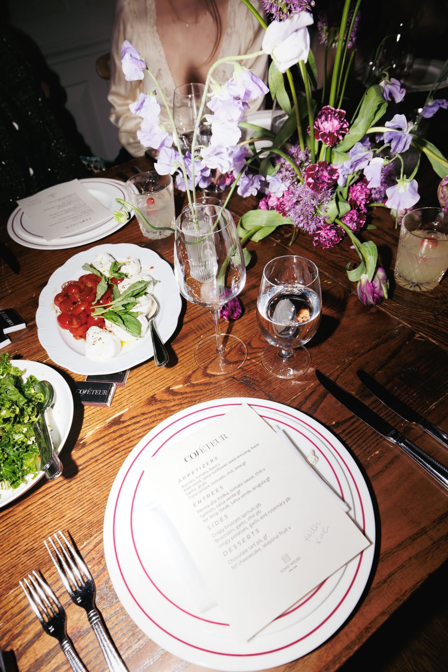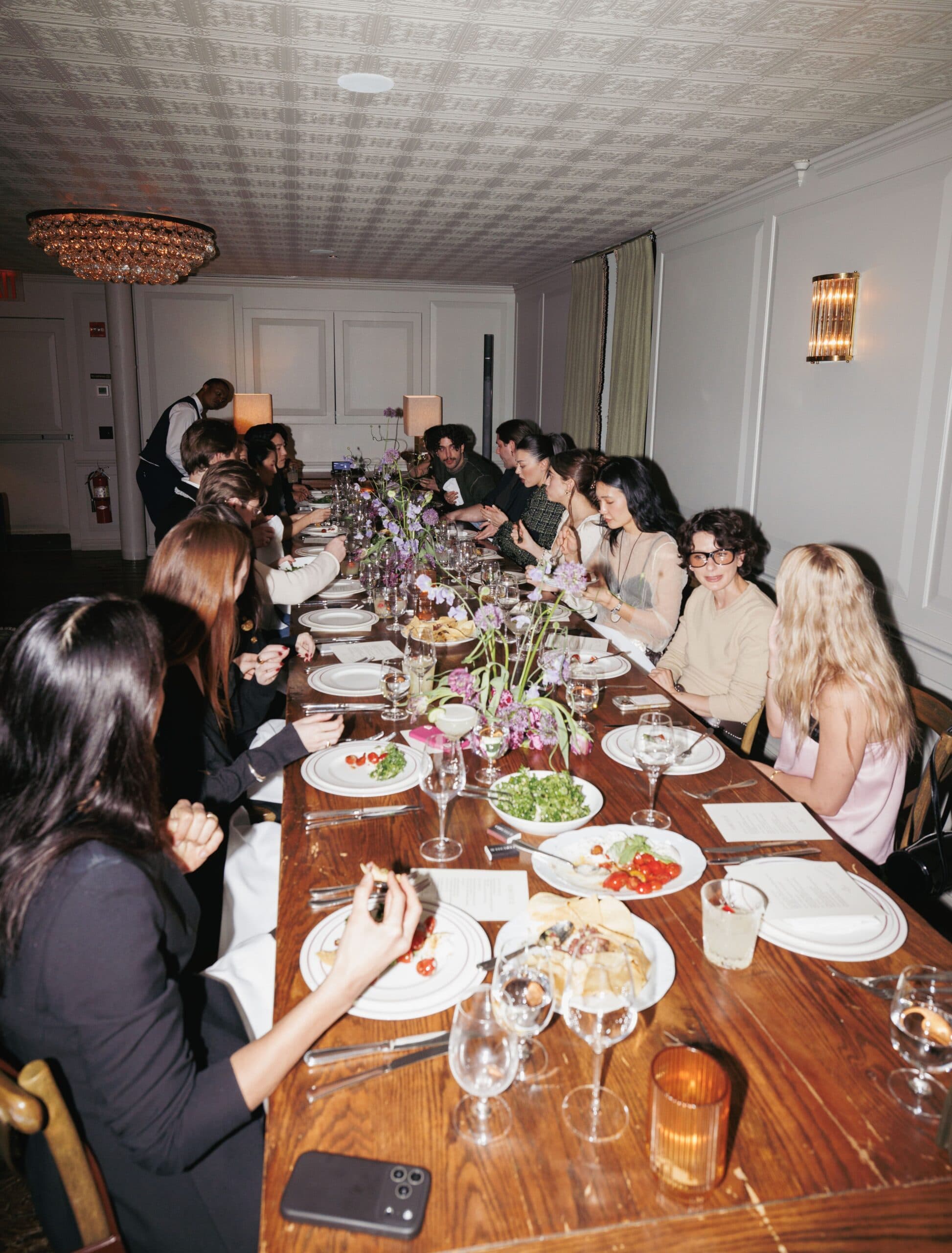 Guests sipped on two Soho House signature cocktails, the Picante and the Eastern Standard, and immediately admired the table, dressed in sculptural pink and purple florals by Sean Stronger Studio. The menu offered burrata, tuna tartare, salmon, and a NY strip steak, and guests were offered the perfect setting and company, including designers Kim Shui, Andrew Kwon, Tanner Richie and Fletcher Kasell, and Mel Usine's Stephen Biga, tastemakers Amelie Zilber, Alyssa Coscarelli, Romilly Newman, and photographer Myles Loftin. The vibes were cozy, relaxed and communal, as guests came together to recover and debrief the whirlwind of the week.