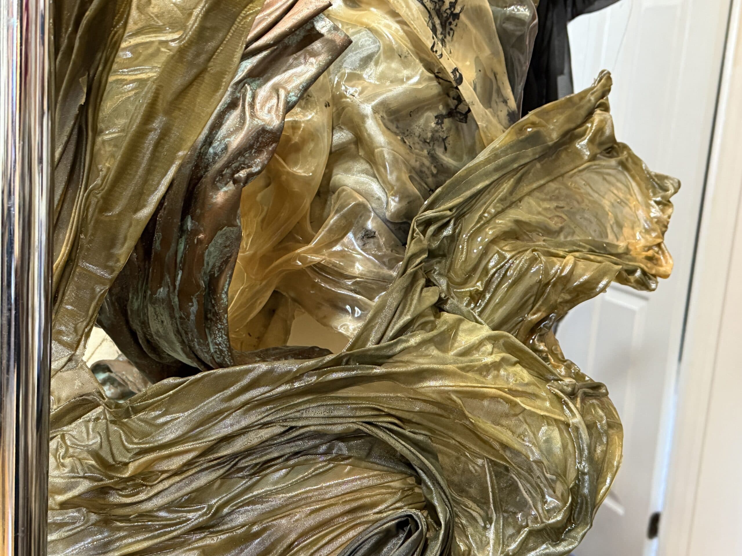 After earning a degree from the Fashion Institute of Technology, Mesches began making pieces, garments and otherwise, with epoxy, fabrics, and anything that he can get his hands on and incorporate. For most of his work, the process begins when the material is liquid. “It’s very messy and toxic,” he says. “It has to be done over an eight hour period of time where it’s curing and it can be moved and manipulated.” Then, everything is hand-dyed, hand painted, or dressed with materials to create different textures or effects. This is all to say that his traditional fashion education led him to feeling creatively free while working with non-traditional materials–this also, in turn, led to him becoming a fearless artist.