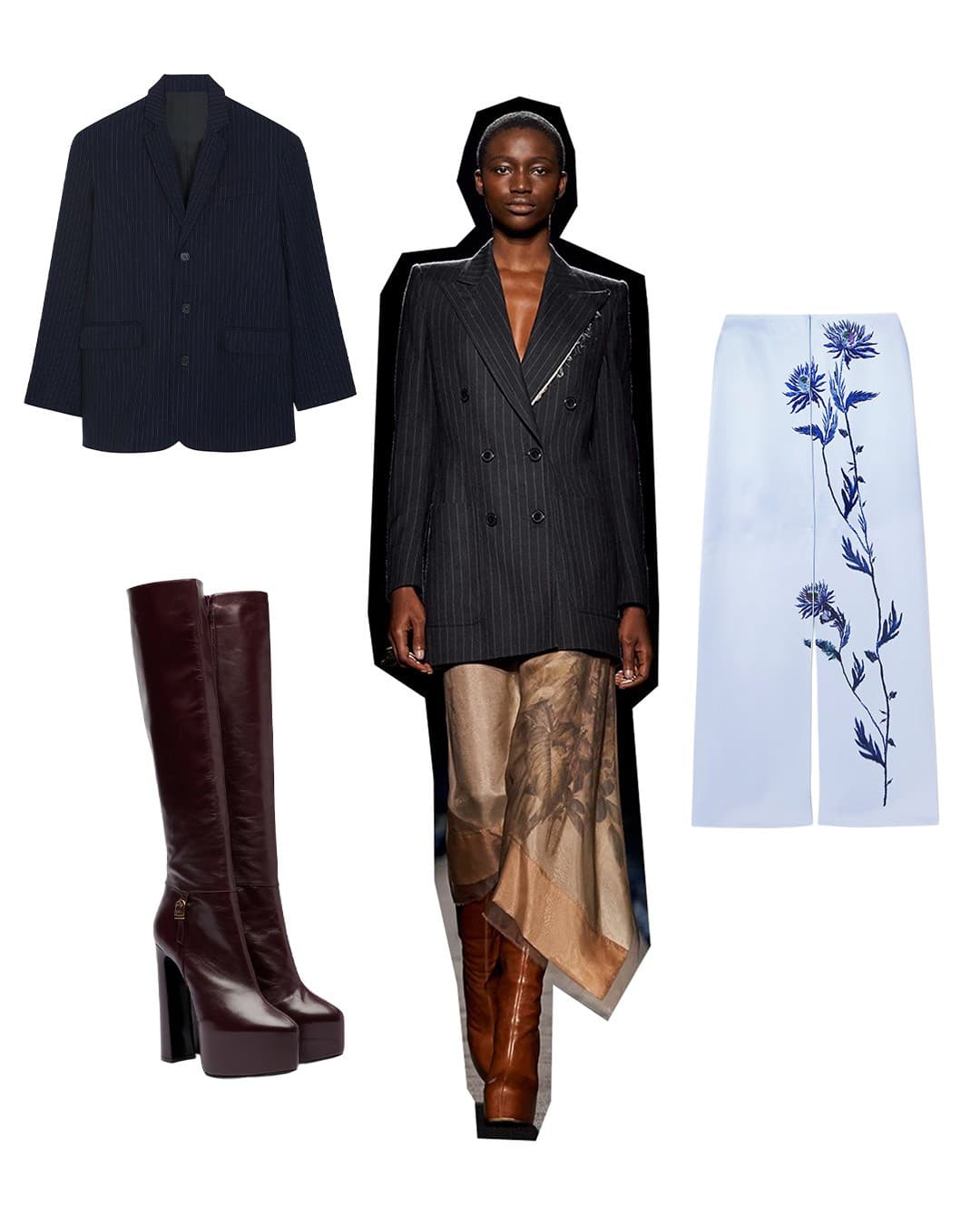 Courtesy of Dries Van NotenI pretty much love everything Dries Van Noten does, and this look proves no different. The boxy pinstripe blazer perfectly offsets the floral skirt, which uniquely contrasts the sleek platform boots. Add some perfectly wonky modern jewelry to complete the ensemble. This look is evidence that playing with fashion is always a good idea—sometimes the least expected combinations make the best outfits.