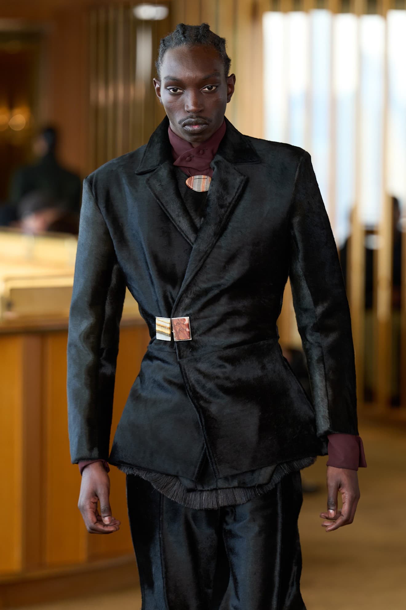 On Hui's Milan runway, bird-shaped clasps held together tweed tops and skirts, blending functionality and decoration. Campillo's New York runway explored the use of decorative clasps, too, with stone-like designs that matched the statement necklaces paired with the looks.